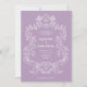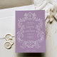 Diese elegante und luxuriöse Hochzeitseinladung besticht durch ein Vintages Kunstwerk mit verziertem Barockstil. Die weiße Abbildung befindet sich auf einem lila Lavendel-Hintergrund. Moderne Skriptkalligraphie und klassischer Text, zusammen mit Ihren Initialen oder Monogrammen, machen dies zu einer eleganten und zeitgemäßen Wahl für Ihre Hochzeit.