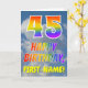 Dieser Spaß und bunten 45. GeburtstagsgrußkartenAusrüstungsbeschreibungen eine Beschreibung eines bewölkten blauen Himmels, zusammen mit einer großen Nr. "45" und der Mitteilung "ALLES GUTE ZUM GEBURTSTAG," ein Regenbogenspektrum habend, inspirierten Steigungsmusterfarbton, auf der Front. Die Front kennzeichnet auch den individuellen Namen der Empfängers der Karte. Die inneren Eigenschaften eine personalisierte Geburtstagsgrußmitteilung oder konnten möglicherweise geklärt werden und verlassener freier Raum, wenn eine Mitteilung eigenhändig stattdessen geschrieben werden soll. Eine kundenspezifische Geburtstagskarte so wäre möglicherweise eine Spaßweise, Geburtstagswünsche zu schicken jemand, das ihren fünften Geburtstag vierzig feiert. [~Z0000371]