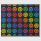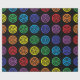 Regenbogen farbige Tupfen mit schwarzen Kreisen innerhalb sie geben den Blick eines Bullaugenentwurfs gegen einen schwarzen Hintergrund.