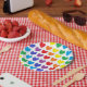 Abstrakte digitale sind von den Reihen der Regenbogen farbigen Herzen gegen einen weißen Hintergrund. Farben einschließlich Rotes, orange, gelb, grün, Blues, lila.