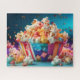 Eine lebendige Schüssel Popcorn quillt über vor farbenfrohen Körnern und spielerischen Kaugummistücken und schafft eine lebendige und verspielte Szene. Die gestreifte Regenbogenschüssel sitzt zwischen einer Streuung glänzender Süßigkeiten, gewirbelter Bonbons und leuchtender Gummibärchen in einer Vielzahl fröhlicher Farben. Popcorn und Süßigkeiten schweben durch die Luft, als ob sie nach oben platzen, und verleihen der Komposition Energie und Bewegung. Der weiche Blauton im Hintergrund und die leuchtenden Highlights verleihen dem Bild eine festliche Süßigkeitenladen-Atmosphäre, die sich fröhlich, einladend und unterhaltsam anfühlt.