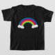 Ein farbenfroher Regenbogen aus blau, rosa, lila, grün, gelb und orange zwischen zwei flauschigen weißen Wolken