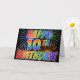 Die Vorderseite dieses auffälligen, lebendigen und aufregenden Grußkartendesigns ist mit einem farbenfrohen, feierlichen Feuerwerk inspiriert, zusammen mit der Meldung "HAPPY 10TH BIRTHDAY!" mit einem farbenfrohen Regenbogen-inspirierten Farbverlauf auf schwarzem Hintergrund. Im Inneren befindet sich eine individuelle Begrüßungsnachricht, oder man könnte sie löschen und leer verlassen werden, wenn eine Nachricht von Hand geschrieben werden soll. Eine solche Grußkarte könnte ein lustiger, glücklicher Weg sein, jemandes zehnten Geburtstag zu feiern. [~Z0000355]