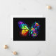 Regenbogen, leuchtend, künstlerisch bemalt Monarchen Schmetterling mit einem Bouquet aus glänzenden, hellen, leuchtenden Rose auf schwarzem Hintergrund. Regenbogenschmetterling.