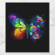 Regenbogen, leuchtend, künstlerisch bemalt Monarchen Schmetterling mit einem Bouquet aus glänzenden, hellen, leuchtenden Rose auf schwarzem Hintergrund. Regenbogenschmetterling.