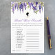 Ein Brautparty-Spiel für das Regency-themed-Brautparty eines Bridgerton-Serienfans. Es hat eine lila Glyzeria Wasserfarbe an der oberen Grenze. Unter und über dem Text ist das Portrait einer Dame als Profil-Silhouette, in einem Oval. Der Titel ist in einer eleganten Kalligraphie geschrieben, in lila. Es gibt 12 verworrene Wörter, sowohl gewöhnliche Wörter als auch (erste) Namen, die alle mit Bridgeron verwandt sind, aber, mit Ausnahme des Namens der Serie, nicht exklusiv für Bridgerton, sodass die Gäste, die nicht damit vertraut sind, die Chance haben, sie zu entschlüsseln. Der gesamte Text ist bearbeitbar, sodass Sie ihn durch andere verworfene Wörter ersetzen (oder ihnen hinzufügen) können, wenn Sie möchten. Die richtigen Antworten: 1. MONDIAD - Diamant 2. HENPAD - Daphne 3. NOSSEA - Saison 4. ELOPPEEN - Penelope 5. DIGROBRENT - Bridgerton 6. SELFLAWS - fehlerlos 7. TROLTEACH - Charlotte 8. TIERWAIS - Wisteria 9. NYOTHAN - Anthony 10. NEQUE - Königin 11. MONIS - Simon 12. KEUD - Herzog