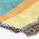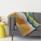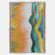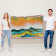 Abstrakte Landschaft von einer Bergvista mit sanften Hügeln und einem Regensturm in Orange, Gold, Blau und Cyan.
