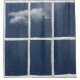 Alte Fensterscheibe aus Holz mit Regentropfen und blauem Himmel mit Wolke. Die Hintergrundfarbe kann geändert werden.