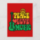 Typendesign von PEACE, LIEBE & MUSIC mit Gitarre, Friedenssymbol, Herz und musikalischen Noten in Gelb, Rot und Grün.