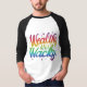 Der T - Shirt präsentiert den Text "Wohlhabend und verrückt" in einem lebendigen Regenbogenfarbenspektrum. Jedes Wort könnte eine solide Farbe aus dem Regenbogen sein, wobei "Reich" potenziell in fett gedruckter, klassischer Regenbogenreihenfolge (rot, orange, gelb, grün, blau, indigo, violett) und "Wacky" unter Verwendung einer spielerischen, umgekehrten Reihenfolge oder einer eher skurrilen Anordnung der Regenbogenfarben geschrieben werden könnte.
