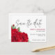 Reiche rote Rosen schmücken die untere links Ecke der Hand und Save the Date ist in einem stilvollen Skript-Set Typografie in schwarz. Die Erholung des Serifentextes ist leicht mit Ihren eigenen Daten personalisiert. Sie interessieren sich auch für unsere individuellen Gästeschilder, die in dieser Sammlung zur Verfügung stehen, um Ihre Hochzeitsmailings zu unterstützen!
