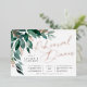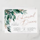 Das elegante Hochzeitsessen mit Probe bietet Aquarellfarben-Eukalyptus-Blätter und grünes Blattwerk, das aus der oberen links Ecke herauskommt und mit Rose-Goldfolienakzenten geschmückt ist. Personalisieren Sie mit Ihrer Zeremonie Probe und Feiern Details auf der rechten Seite ausgerichtet. Die Karten werden zu einem festen Waldgrün umgeschaltet.
