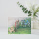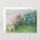 Cette carte postale présente une reproduction de ma peinture au crayon acrylique et coloré d'un laboratoire jaune et de bicyclettes.