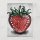 Reife Strawberry ist plump, rot und scharf gepunktet, gepunktet und lustig. Rot, Grün und Weiß mit grauem Hintergrund.