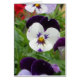 Eine niedliche digitale Fotografie, die eine vertikale Reihe von vier Stiefmütterchen, jede ein anderer Ton und ein Schatten von Lila mit einem Stückchen der unscharfen roten Pelargonie im Hintergrund kennzeichnet.