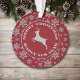 Un renne en faux argent brillant est au centre de ce magnifique ornement de Noël. Il est entouré d'un texte argenté qui dit Joyeux Noël Bonne Année. Une bordure circulaire de flocons de neige argentés finit les bords. Tout est placé sur un arrière - plan rouge de Noël. L'autre côté de l'ornement a la même image, mais avec votre texte personnalisé. Changez l'année en votre nom, si vous voulez. *Veuillez noter que l'image est imprimée et ne contient aucune parties scintillant réelle.*