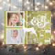 Beaux cartes photos de vacances d'inspiration vintage avec rennes blancs sur un arrière - plan vert moutarde avec des flocons de neige muets, texte qui lit Joy, et les zones que vous pouvez facilement customiser avec deux photos, vos noms, et l'année en cours. Photographie © Storytree Studios, Stanford, CA