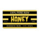 Schwarz und goldgestreifte honigfarbene Krüge-Etiketten mit goldtropfender Honigtypografie und individuellem Text für den Imker-Firmennamen, Kontaktinformationen und das Nettogewicht des Produkts.