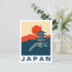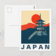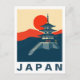 Unternimm eine Reise in die Vergangenheit mit diesem atemberaubenden Vintage-Reiseplakat von Japan. Das Design zeigt eine ikonische mehrstöckige Pagode im Vordergrund, vor dem beeindruckenden Bild einer riesigen roten Sonne, die über einem majestätischen Berg aufgeht, der stark an den Berg Fuji erinnert.