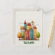 Diese Reisepostkarte zeigt eine charmante Illustration einer farbenfrohen Stadtlandschaft mit skurrilen Häusern in verschiedenen Formen und lebendigen Farben, ähnlich wie die schöne estnische Hauptstadt Tallinn.