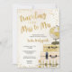 Reise von Miss zu Frau Braudal Dusche Einladung mit einem schwarzen und goldenen Stapel von Koffern überzogen mit einem Globus und mit Konfetti und einem kaum vorhanden blüten Hintergrund mit einem koordinierenden Gold Konfetti Rückendeckung. Verfügbare Koordinationsgegenstände. Bitte kontaktieren Sie den Designer direkt unter info@lemontreecards.com , um passende Artikel anzufordern, die nicht bereits in der Sammlung angezeigt werden.