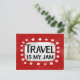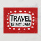 "Travel Is My Jam" ist ein lustiges Textdesign mit weißer Akzent-Form, umgeben von weißen, weißlichen, weißlichen, weißgestrichenen Punkten.
