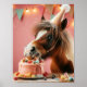 Die sonnige Wandkunst eines Pferdes, das Geburtstagskuchen isst. Ideal für Pferdefreunde.