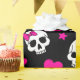 Ribboned Schädel umgeben durch Herzen u. Sterne in einem klaren Rosa gegen einen schwarzen Hintergrund.