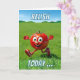 Relish heute ... für morgen kann Ketschup sein! Funny Ermutigung Tomato Pun Cartoon Papier Grußkarte. Tomatenfigur aus Cartoon zoomt durch das Gras, während es einen Happy Run macht. Art, Bild und Vers Copyright © Shoaff Ballanger Studios, 2025.