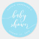 Baby Shower Aufkleber mit den Worten "Baby Shower" in einem entspannenden kursiven Skript in weiß vor einem pastellblauen Hintergrund. Personalisieren Sie es, indem Sie den Platzhalter-Text ersetzen. Für weitere Optionen, wie zum Beispiel den Schriftart zu ändern und ihn zu verändern, erweitern Sie die /Contract-Kurve oder den Abstand zwischen den Buchstaben, klicken Sie auf die Schaltfläche "Anpassen". *Bitte beachten Sie, dass das Zazzle-Wasserzeichen, das in der Zoomvorschau angezeigt wird, NICHT auf dem gedruckten Endprodukt erscheint. © Rosewood and Citrus
