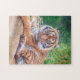 Nahes Foto eines gekühlten Tigers, der sich auf dem Holz mit grünem Blattwerk zurücklehnen kann.
