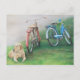 Auf dieser Postkarte ist eine Reproduktion meines originalen Acrylgemäldes und farbigen Bleistiftgemäldes eines gelben Labradors und Bikes zu sehen.