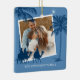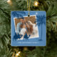 Modern religious christmas ornament featuring a blue background, 2 photos for you to replace with your own, the three kings, desert palm trees, the star of Bethlehem, and your family name.