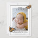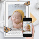Célébrez et annoncez vos plus grandes nouvelles avec ces belles cartes papillon! Partagez vos bonnes nouvelles avec votre famille et vos amis et montrez votre style! La carte présente des oeuvres d'art d'un papillon Monarque flottant amoureusement autour d'une photo portrait de votre nouveau bébé doux! Avec une bordure en jaune doré et un texte classique, ces cartes intemporelles sont élégantes et contemporaines. La superposition de texte dit : "Rencontrez (nom du bébé)" suivi d'un espace pour customiser avec les statistiques de naissance de votre bébé, ou toute information que vous voudriez. Backside propose une photo de portrait supplémentaire, parce que qui peut choisir une seule photo de son adorable et précieux bébé ? L'art papillon de l'avant est modelé sur l'arrière pour un thème cohésif.