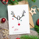 Une image abstraite moderne, drôle et mignonne, d'une tête de renne avec un nez rouge. Avec des ornements de Noël, des billes accrochées aux bois. Arrière - plan blanc, Couleurs : blanc, rouge, gris, bleu, vert. Lettres rouges et texte : Avec amour. Customisez et ajoutez votre nom de famille. Retour : arbres de Noël noirs et blancs.