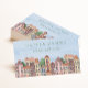 Un carte de visite adapté à un professionnel qui travaille avec des maisons comme un agent immobilier, un palpitant, un rénovateur, un constructeur ou un nettoyeur de maison. Sur un arrière - plan d'aquarelle bleu, une illustration d'aquarelle d'une rangée de maisons dans une rue est montrée. Personnalisez-vous en ajoutant vos coordonnées commerciales et de contact à l'avant et à l'arrière.