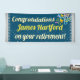 Perfektes Banner für Ihren pensionierten Mitarbeiter, Chef oder Freund. Ein blauer Hintergrund mit Konfetti Sternen personalisiert mit dem Namen des Rentners.