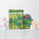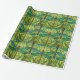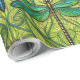 "Repeating dragonfly pattern on green wrapping paper, shown unrolled and flat. The design features teal dragonflies on vibrant green foliage."