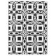 A repeating geometric pattern features black and white squares with interlocking oval shapes. The design is symmetrical, creating a visually striking contrast.