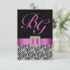 Cartes de réponse de mariage élégantes et audacieuses avec un motif à rayures zèbre noir et blanc avec un monogramme rose personnalisable de deux initiales et un ruban de satin rose IMPRIMÉ avec une broche de strass carrés avec des diamants. Conception par Elke Clarke©. Personnalisez avec vos monogrammes, noms et texte de réponse de mariage. Ajoutez toutes les informations de réponse de mariage au verso de la carte en utilisant les invites de menu faciles à utiliser de Zazzle. Vous devrez peut-être sélectionner "personnaliser" et utiliser le menu d'édition pour modifier l'espacement afin qu'il apparaisse à l'écran comme vous le souhaitez. Besoin d'une couleur de ruban ou d'un motif d'impression à rayures zèbre différent, veuillez contacter luxuryweddinginvitations@gmail.com
