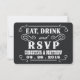 Manger, boire et être marié -- Cartes de réponse RSVP pour invitation de mariage western country rustique vintage avec coins arrondis en option. -- Boucles tourbillonnantes, volutes et typographie rustique western ancienne en texte blanc sur fond de toile de jute noirci. Ajoutez les noms des mariés et les informations de mariage dans ce modèle facile à utiliser. Élégant et romantique, le lettrage rétro peut être facilement modifié pour vos thèmes de mariage formels ou semi-formels. Le style country moderne décontracté mais chic est parfait pour les mariages rustiques tendance avec une touche amusante de charme sophistiqué du sud-ouest pour les couples traditionnels. Veuillez nous contacter pour obtenir de l'aide pour la personnalisation si vous avez besoin d'un espace supplémentaire pour vos coordonnées de mariage. D'autres tailles et styles de tableau noir sont disponibles, ainsi que des timbres-poste assortis, des accessoires de mariée, des cadeaux de douche et des essentiels de pochette de mariage pour les mariées DIY à petit budget.