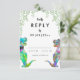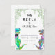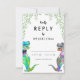 Carte de réponse RSVP pour le mariage coloré et amusant à thème dinosaure avec mariée et mariée en dinosaure avec une aquarelle de verdure botanique pour apporter la joie de la jungle jurassique préhistorique à votre jour de mariage. Calligraphie moderne de typographie capricieuse avec facile à personnaliser modèle. Unique Tyrannosaurus Rex mariée et mariée aux couleurs psychédéliques funtes avec aquarelle feuillage eucalyptus oeuvre originale de l'artiste Catherine Sweetman Idéal pour la réception du jour de mariage ou le dîner de répétition. La suite mariage jumelée comprend tout ce dont vous aurez besoin lors de votre voyage mariage amusant