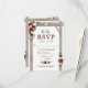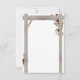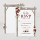 Cartes de réponse de mariage automnal élégant avec un fond blanc chic classique qui peut être changé en n'importe quelle couleur, une exposition florale aquarelle de style burgundy, rouge marsala et blush sur une arche de mariage en bois rustique, un cœur sculpté avec les initiales des couples, et un modèle de RSVP de mariage moderne avec une option de menu.