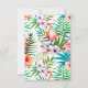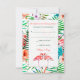 Une carte-réponse tropicale, aux couleurs vives et peinte à la main, avec un fond floral luxuriant et des fougères présentant des flamants roses que l'on peut déplacer à l'endroit souhaité, agrandir ou réduire (+-) ou supprimer.
