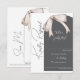 Personnalisez cette simple et moderne carte de réponse RSVP pour invitation de mariage formelle en forme d'arche, conçue pour correspondre aux modèles d'invitation de mariage en forme d'arche ou en acrylique de notre vitrine, avec une esthétique élégante et coquette comprenant un ruban blanc aquarellisé, une typographie monochrome ludique et un design d'arche gris charbon sur le devant, et un code QR pour le site web du mariage avec des instructions pour répondre en ligne sur le verso. Envoyez à vos personnes préférées un premier aperçu amusant de l'ambiance de votre journée de mariage avec cette carte d'insertion unique ! Modèle facile à éditer - il suffit d'entrer vos informations, de télécharger votre code QR (ou de supprimer le design du verso si non nécessaire). Vous pouvez même apporter d'autres modifications, déplacer les éléments de design et le personnaliser en cliquant sur le bouton "Éditer à l'aide de l'outil de conception" en bas de la fenêtre "Personnaliser" ! Les demandes de conception personnalisées et les questions sur le modèle sont toujours les bienvenues - cliquez sur le bouton