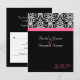 Carte RSVP pour correspondre à notre invitation de mariage élégante avec fond noir et accent rose magenta fuchsia. Fond noir frais et élégant avec accent damassé noir et blanc, et bande horizontale colorée. Personnalisez en ligne avec vos détails de mariage.