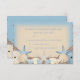 Une belle carte de réponse de RSVP de mariage de destination avec un thème de plage exotique. Un joli motif de texture de sable de fond dans des tons de crème neutres et des nuances de bleu océan est parsemé de beaucoup de petits galets de plage. Sur les galets se trouvent une variété de coquillages, d'oursins, d'étoiles de mer et de perles.