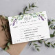 Un arrière - plan blanc, du texte noir. Décoré de fleurs de lavande et de verdure d'eucalyptus. Personnalisez et ajoutez la réponse par date et sélections de menu. Retour : Violet couleur arrière - plan