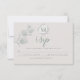 Réponse au mariage | Monogramme de eucalyptus de sauge argentée Géométrique Botanique Mariage - Feuilles de eucalyptus transparentes en dollar argenté aquarelle dans la sauge verte avec une boîte géométrique argentée moderne décorative à un angle de 45 degrés tenant un avis carré blanc cassé pour le cadre de monogramme - - le tout posé sur un fond beige chaud de latte. Une autre création de design pour mariage par © WhimsicalArtwork™ Une approche ludique de la typographie dans le texte - avec les initiales du nom de la mariée et du marié entourées d'un carré géométrique - en deux couleurs (sauge et argent) - suivies de polices modernes coordonnées.