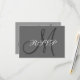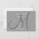 Un design simple et moderne de carte de réponse RSVP pour mariage avec votre initiale de nom de famille en gris et blanc, ce qui en fait une carte RSVP de mariage simple et polyvalente, car votre initiale créera votre propre design unique avec votre choix de couleurs pour le texte et l'arrière-plan. Conçu par Elke Clarke ©2008. Personnalisez avec votre monogramme et vos couleurs de mariage. Ajoutez tout votre texte de réponse RSVP au verso de la carte en utilisant les invites de menu faciles à utiliser de Zazzle. Fourni avec une enveloppe blanche vierge. Pour les accessoires assortis, voir les liens ci-dessous.